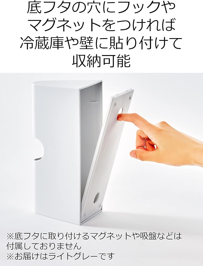 ●底フタの穴にフックやマグネットを付ければ、冷蔵庫や壁に貼り付けて収納することも可能です。※フックやマグネットは付属しておりません。