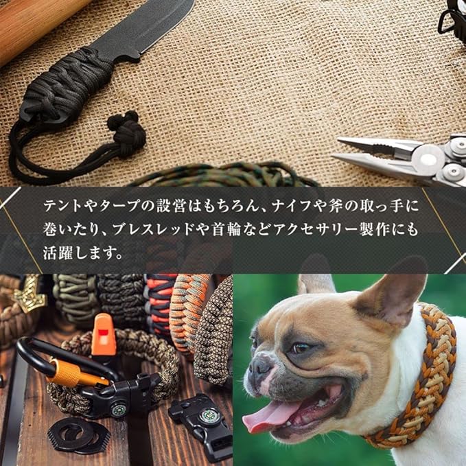 優れた耐久性と柔軟性があり、テントやタープの設営時のガイロープとしてはもちろん、パラコードブレスレッドなどアクセサリーの制作にも最適です。