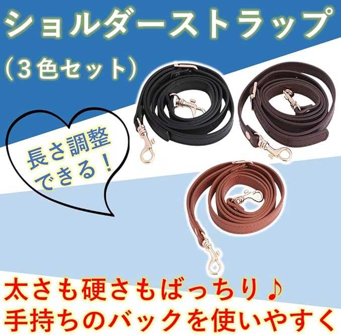 約1.1cm幅の合皮素材(PUレザー)のショルダーストラップ、3本セット。肩に掛けても重くない軽量な70gで長時間のご使用にもおすすめです。