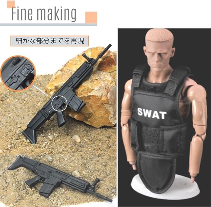 このアクションフィギュアは、1/6スケールで、全長30cm、全身30か所の可動関節を持っています。SWATチームのメンバーをリアルに再現した完全装備セットで、他社の1/6フィギュアとも併用可能です。PVC材質で、商品箱サイズは22*35*6.2cm、武器・防具・その他パーツ合計20種が同梱されています。初期不良に対する交換・返品対応も行っております。