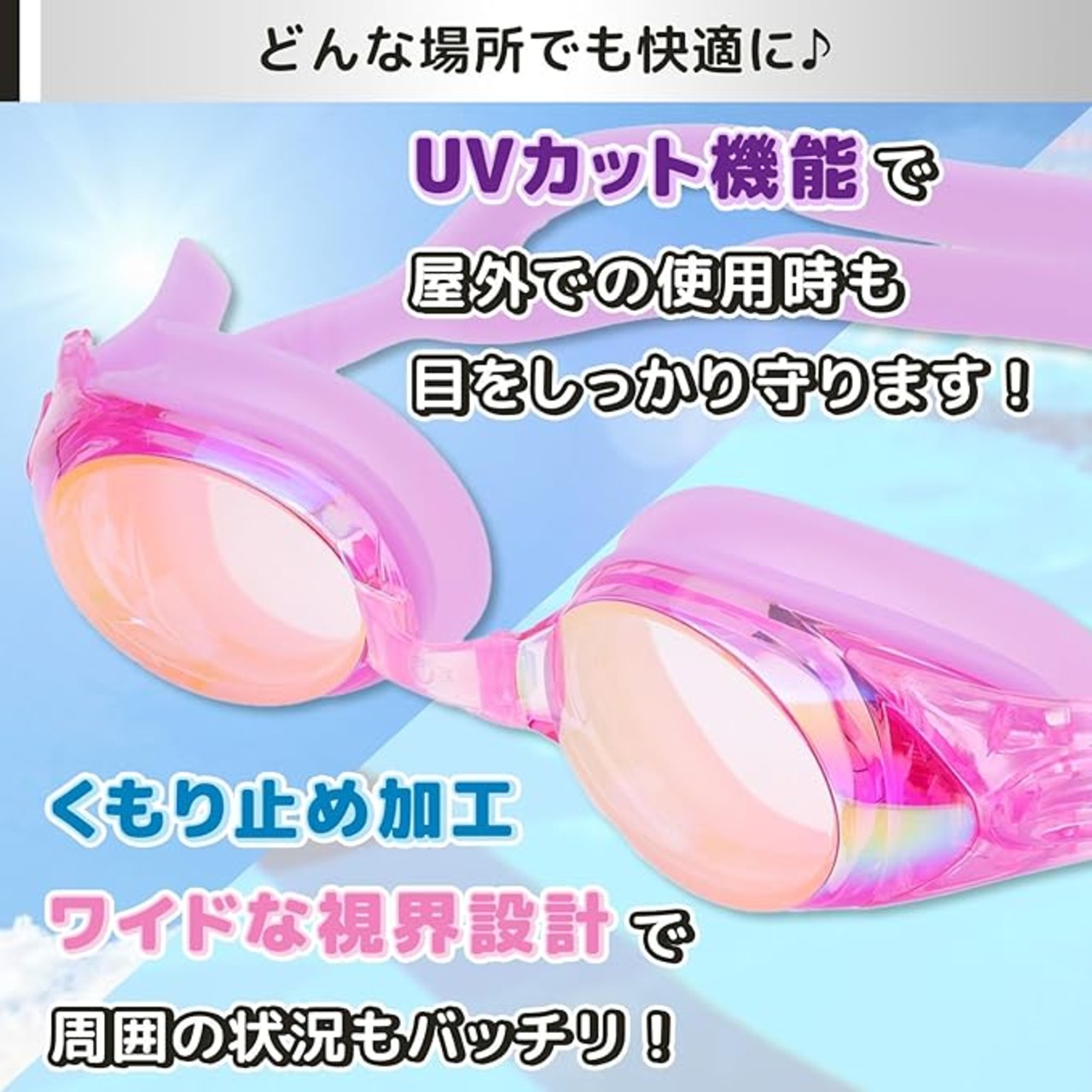 ✅【どんな場所でも快適に泳げます♪】くもり止め加工で視界をクリアに保ち、ワイドな視界設計で周囲の状況もバッチリ確認可能。さらに、UVカット機能で屋外での使用時も目をしっかり守ります!
