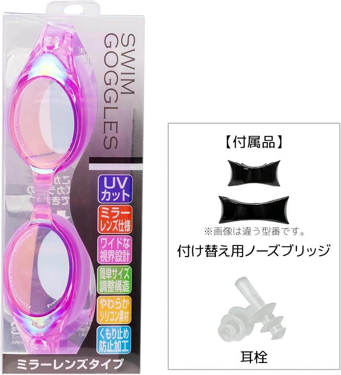 【仕様】UVカット、ミラーレンズ、ワイドな視界設定、簡単サイズ調整構造、やわらかシリコン素材、くもり止め防水加工