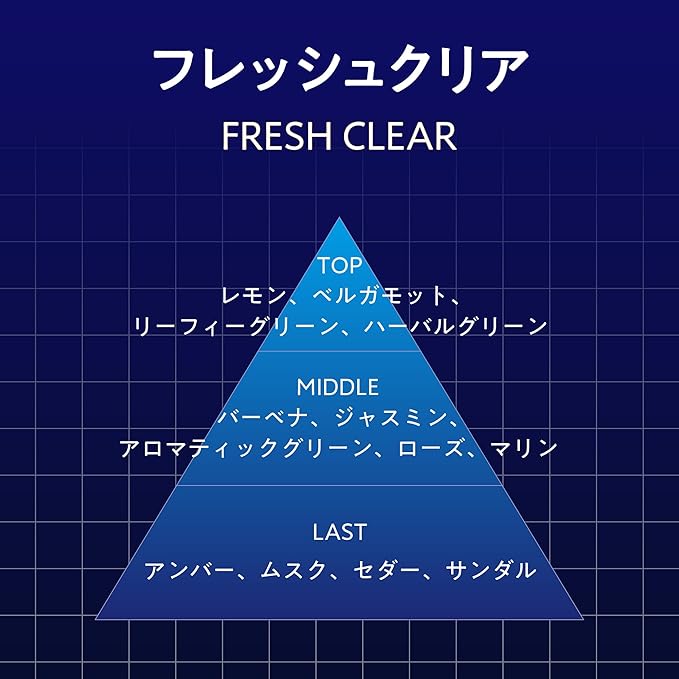 フレッシュクリア:香りの構成 ●トップノート :アップル、ウォーターメロン ●ミドルノート : ジャスミン、ローズ ●ラストノート : ムスク、パウダリー、サンダルウッド