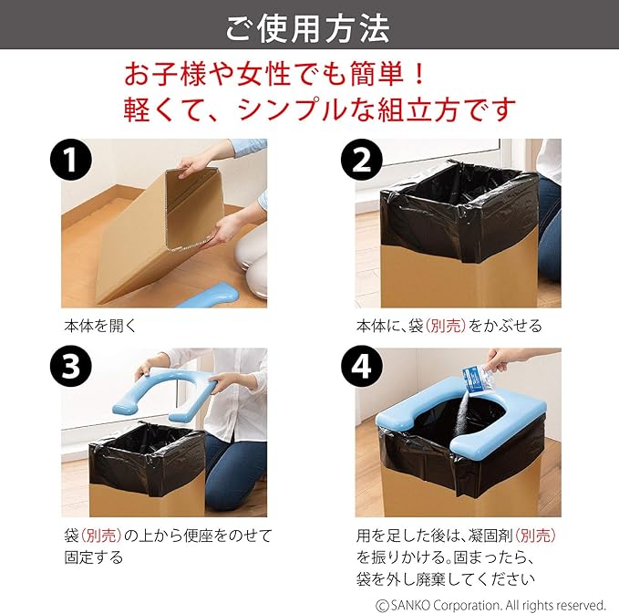 本品は、本体と便座のみのセットですので、ご使用の際は汚物袋や凝固剤等を別途ご用意ください