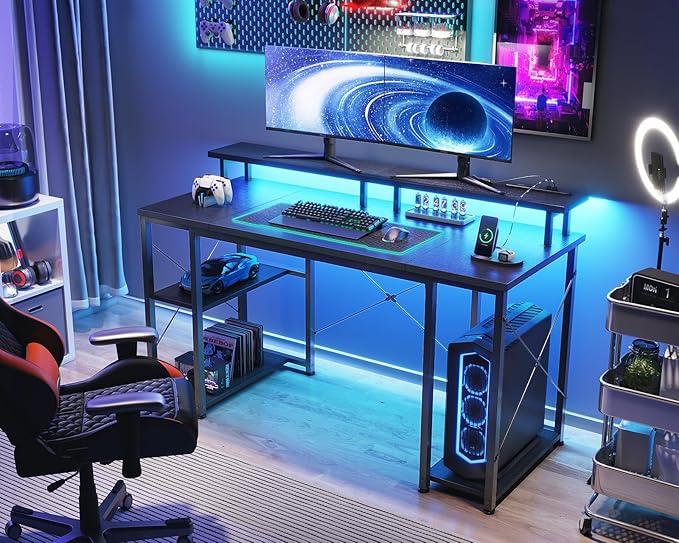 AODK ゲーミングデスク パソコンデスク コンセント&LED付き 机 pcデスク 幅120cm 両側ラック&モニター台付き 勉強机 ゲームデスク computer desk ワークデスク オフィスデスク 長机 左右入れ替え対応 ブラック
