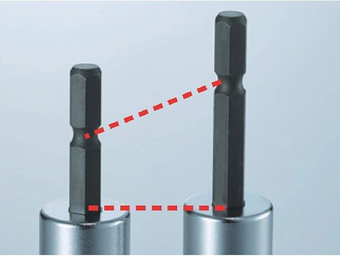 ●業界トップクラスの軸強度を実現しました。●基本的な形状の電ドルソケットです。●長軸のトーション効果により、長寿命です。●ソケット部の六角穴に六角軸を圧入することで、ねじれ・折れに強く、トルク伝達効率が高いです。●深穴式になっており、雄ネジの飛び出しが長い場合でも使用可能です。●ボルト・ナットを確実にとらえ、面接触で角を傷めません。
