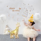 【華やかなハッピーバースデーの装飾セット】 happy birthdayフェルト生地バナーx1、ケ-キ飾り*1個、星*9個、キリン バルーンx1、ケーキトッパーx1、90cmタッセルタペストリーx1、バルーンx2などが含まれています。