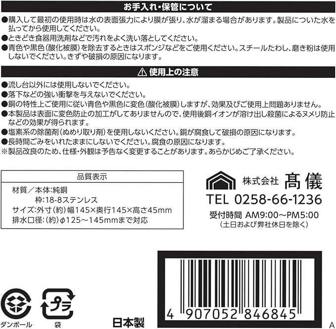 髙儀(Takagi) パンチング 排水口 ゴミ受け 銅製 大 排水口径125~145mm対応 浅型 日本製 キッチン シンク 排水溝 ごみ受け ごみカゴ ストレーナー 水切り 銅イオン 悪臭 ぬめり つきにくい 高儀 たかぎ TAKAGI