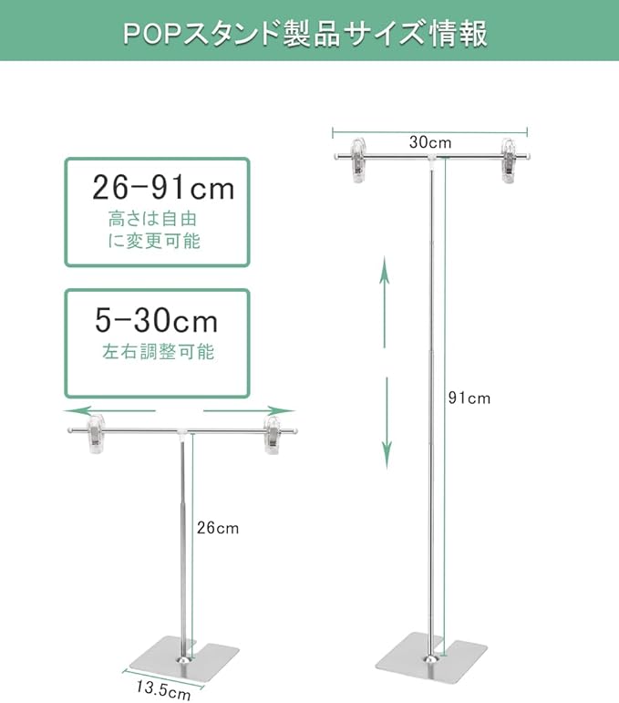 【POPスタンドの仕様】 高さ26cm~91cm 幅30cm 重さ 200g 土台ベースサイズ:幅13.5cm 長さ13.5cm、1個入り