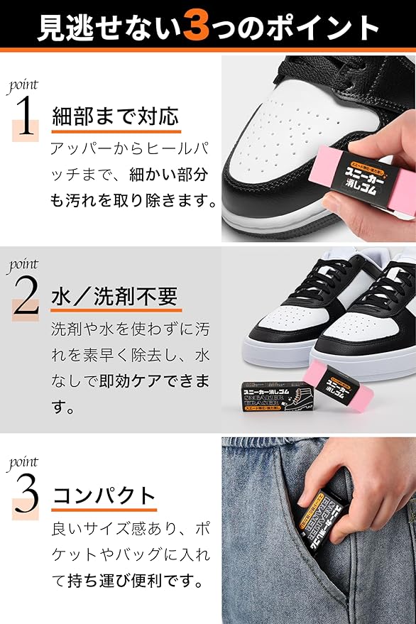 【2in1消しゴム・様々な素材対応】2種類の消しゴムを1つに融合しました。ホワイト部分では、柔らかなゴム素材で作られ、レザー、キャンバス、ゴムラバーに適用します。泥やほこりを簡単に吸着して落とします。グレー部分では研磨剤を混ざっており、スエード、ヌバックなどの起毛素材に対応し、頑固な汚れに効果的です。ほぼ全ての素材に対応する便利な一本です