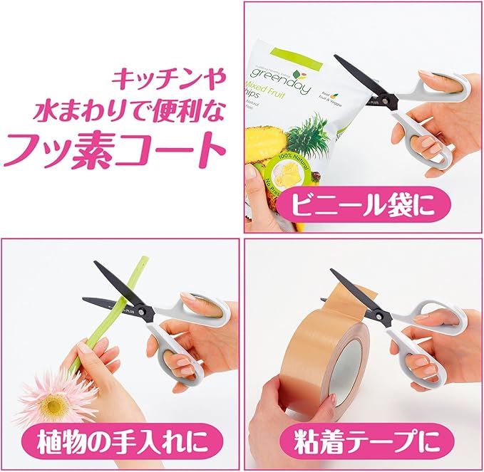 刃にフッ素樹脂コーティングを施して非粘着性を高めているため、ベタつきが気になる梱包用のガムテープを切る際や、