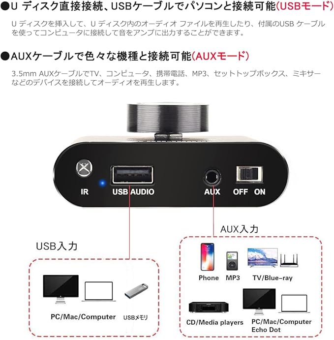 【高い実用性】このアンプは有線と無線という二つの接続方法があり、bluetoothスマホと接続できるだけでなく、オーディオケーブルで他の設備にも接続できます。使用者はご自由に好きな方式を選びます。スマホ、パソコン、タブレット、MP3等様々な機種が対応できます。