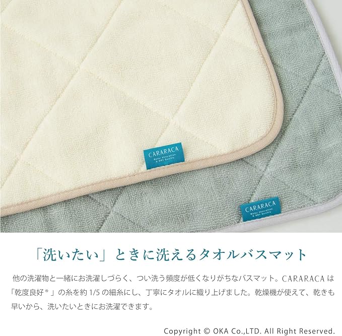 吸水速乾性に優れた「乾度良好」の糸を使用したタオルのように気軽に洗えるバスマット「カララカ」。他の洗濯物と一緒に洗濯できて乾燥機も使えます。だから忙しい毎日でも乾きが早いから洗いたいときにお洗濯ができます。発売より30年以上のロングセラー「乾度良好」の繊維を使用しているので吸水性、速乾性に優れ洗濯後の脱水した時点で「乾いている」と感じられるほど。また繊維上の細菌の増殖を抑える抗菌防臭加工がされているので家族が多いご家庭でも安心してご使用いただけます。