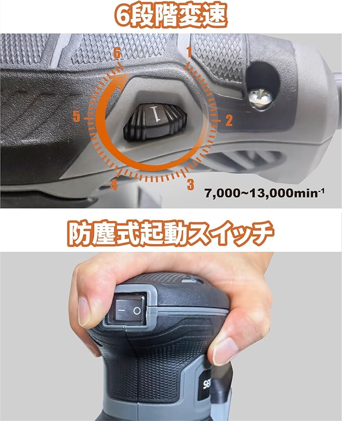 「6段階変速」用途にあわせて回転を変えられる、回転数調整ダイヤル付。ダイヤルを回して1~6段階の研磨速度(7,000~13,000min-1)が選べます。