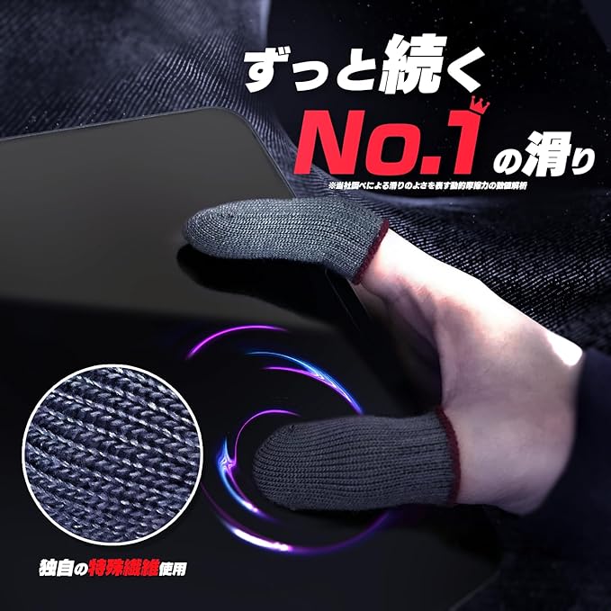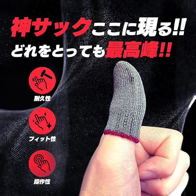 【DvS指サック】という世界一位のゲーマーが開発したこの元祖スマホゲーム用指サックは、滑りやフィット感・操作性・耐久性に最も長けています。日本一位のプロ選手も多数愛用しています。吸水性や速乾性も兼ねそろえており、唯一洗濯も可能な長寿命モデルです。