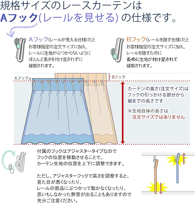 フック:アジャスターAフック(レールを見せる)つき⇒上部にレールを隠すための生地はほとんどついていません(約1cmのみ)。レールの下にぶら下がり、見せるように掛かります。
