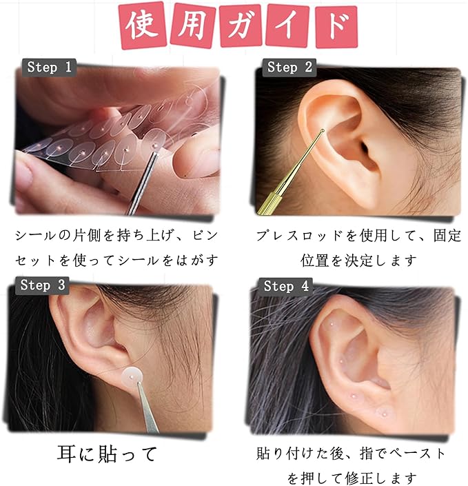 【使いやすい】1.押し棒を使ってツボを確認する。2.耳とピンセットを清潔にする。3.ピンセットを使用してパッチを耳の該当するツボに貼り、手で軽く押して固定すればよい。操作は簡単で、専門的な指導は必要ありません。