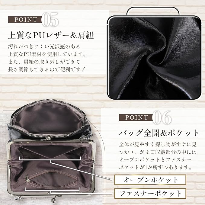 【 サイズ&カラー 】サイズ:(約) 縦 16 cm 横 19 cm 幅 8 cm 重さ:約 360g ショルダーベルト:約 93cm ~ 約 108cm (取り外し可能) 【 カラー 】・ブラック ・ダークレッド ・ココナッツブラウン 【ストラップ用金具】仕様変更により、同じ側に付いている物と対角に付いている物があります。