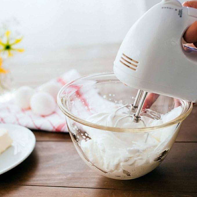熱湯、電子レンジOKの耐熱ガラス製ボウル。深さがあり、ハンドミキサーでも使いやすい形状