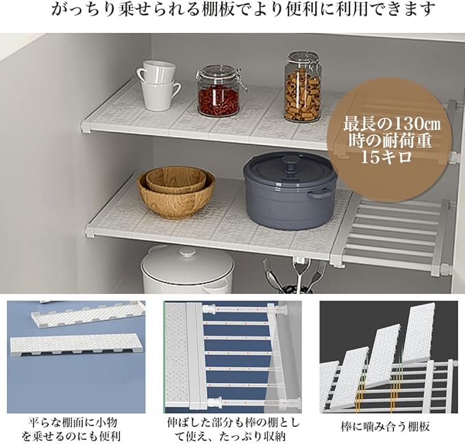 【改良型・強力突っ張り棚】材質 パイプ:鉄製 エポキシ樹脂粉体塗装樹脂部品:ABS樹脂 合成ゴム 耐荷重:約15-30kg(最短時30kg、最長時15kg)。変形しにくく、裂けませんきれいに磨き、安定性が高いです。つっぱり棚は ステンレス+ABS樹脂 合成ゴム 製なので、水分等を触れてもサビやカビが出ないです,恒久耐用です。