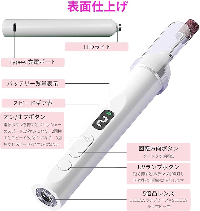 【包装】USBケーブル1本、爪切り6個、研磨テープ6個を含み、研磨、研磨、彫刻、天然アクリル爪除去、ゲル甲油浸粉、角質層などのほとんどの用途に適している。