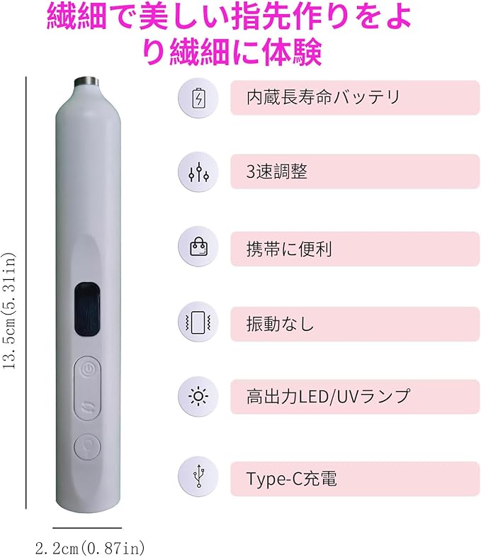【多機能爪切りセット】電動爪ヤスリセットの頭部には自動LEDライトがあり、尾部にはUVネイルライトがある。6種類の異なる爪ドリルと研磨テープがあり、3種類の異なる速度で爪の手入れ、爪の剪定、爪の研磨、アクリル爪の除去、ジェル爪と粉状爪の除去に使用できます。 【ワイヤレスと充電】携帯に便利、充電可能、コードレス電動ネイルドリルは180 mAh電池を内蔵し、充電2時間後にコードレスで1-1.5時間使用でき、しかもUSBケーブルを使用するだけで充電できる。 【UVランプ設計】ドリルの反対側にUVランプを設置し、60秒後に自動的に消灯するように設計しました。道具を変えずに爪を乾かすことができ、日常旅行の手伝いになります。コンパクトで持ち運びしやすく、友人や家族と一緒に自宅でDIYするのに適しています 【低騒音、低カロリー】電動爪緩衝器は人体工学設計を採用し、握りやすい。強力で静かなモーターがあり、放熱量が低い。爪切りドリルを使用するときは騒音が低く、カロリーが低く、振動が小さく、快適な爪のDIY体験をもたらします。 【包装】USBケーブル1本、爪切り6個、研磨テープ6個を含み、研磨、研磨、彫刻、天然アクリル爪除去、ゲル甲油浸粉、角質層などのほとんどの用途に適している。