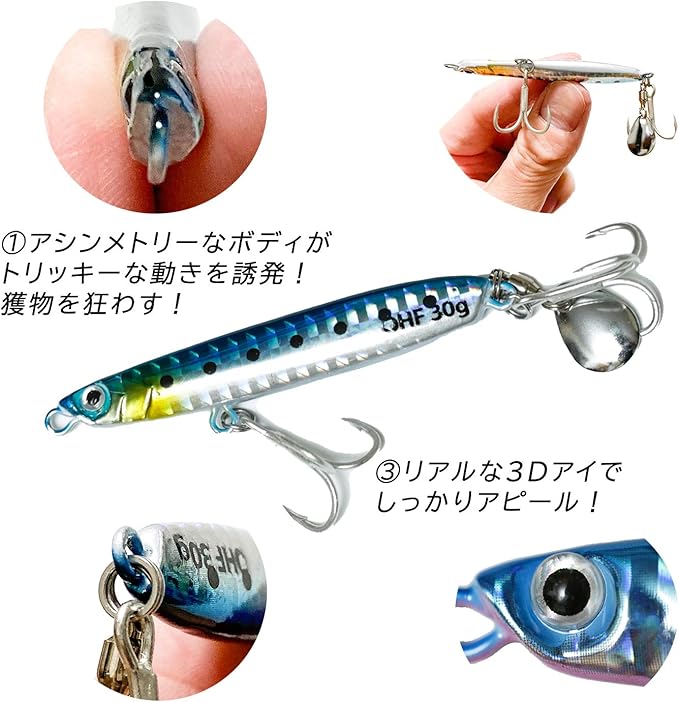 基本的にはボトムはからトップまでタダ巻OK、キラキラとフラッシング効果でヒラメを狂わす! リアウエイト設計で圧倒的な飛距離を実現 30gで100mは軽く飛ぶ設計ですので女性にもおすすめです。