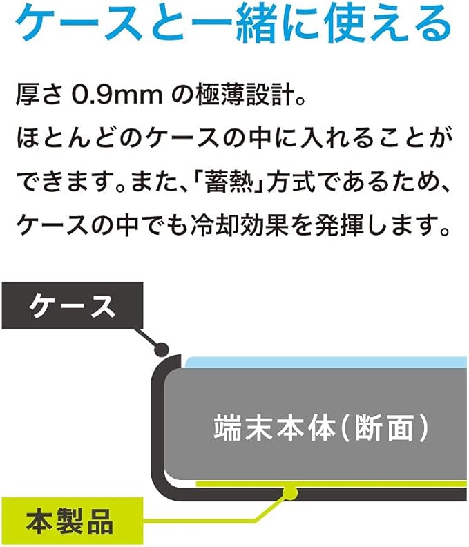 【極薄0.9mm、ケースと一緒に使える】薄さ0.9mmのシートなので、お手持ちのケースと併用ができます。3層蓄熱構造により、ケースの内側でも効果を発揮します。