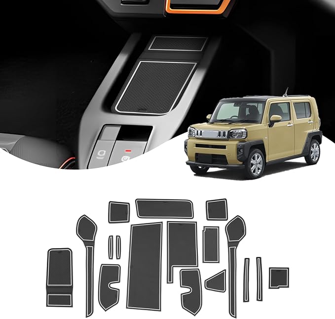 【車種専用・傷防止】新型ダイハツ タフト 専用に設計されたラバーマット(17枚入り)は、各部品が車両の精密データに基づいて設計されています。そのため、寸法のズレを心配する必要はありません。表面は高耐久性素材を採用しており、傷がつきにくい仕様です。特に、トレイに缶コーヒーや小物を置いた際の擦れや傷から保護する効果を発揮します。車内を綺麗に保ちながら、毎日の使用にしっかり対応します。