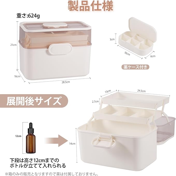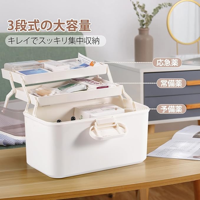 大容量救急箱:家に置いて常備薬をコンパクトにまとめられるお薬箱です。3段の階段式トレーでスペースを無駄なく活用でき、使用頻度や種類ごとに分類して収納可能。必要な時にサッと取り出せます。サイズ(約):16奥行きx28.5幅x21高さcm