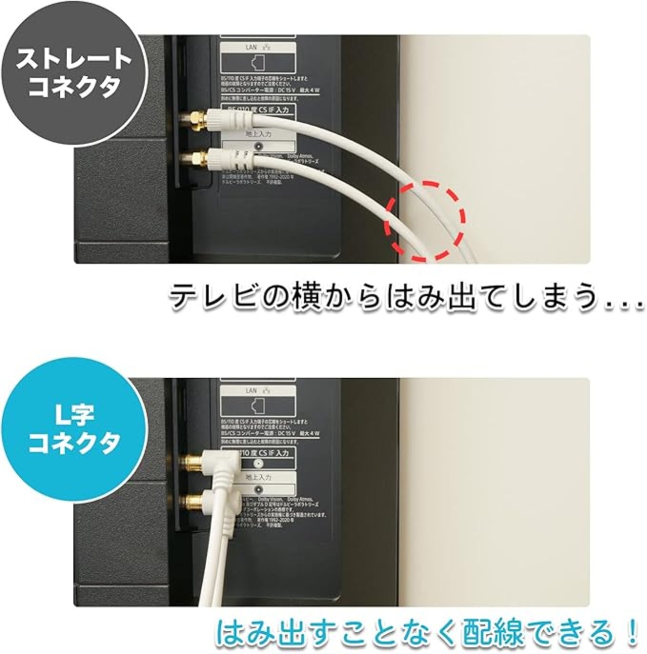 ■地デジ放送、BS/CS放送をそれぞれ視聴したいときはコレ! 地上波(UHF)と衛星波(BS/110度CS)を効率よく分け、1台のテレビで地デジ、BS、110度CS放送を視聴できます。 ■新4K8K衛星放送対応 従来の地デジ、BS、110度CS放送に加えて、最新の4K/8K放送にも対応しています。 ■ケーブル一体型構造 分波器本体と出力側ケーブルが一体型のつくりになっているため、分離型に比べて接続損失を軽減することが可能です。 ■便利なL字差込式コネクタ 狭い隙間での接続にはもちろん、テレビのアンテナ端子位置によっては、配線の露出を防ぐことができ非常に便利です。 ■BSアンテナ電源供給可能 【使用上の注意】 ご使用には入力用のアンテナケーブル(別売)が必要です。