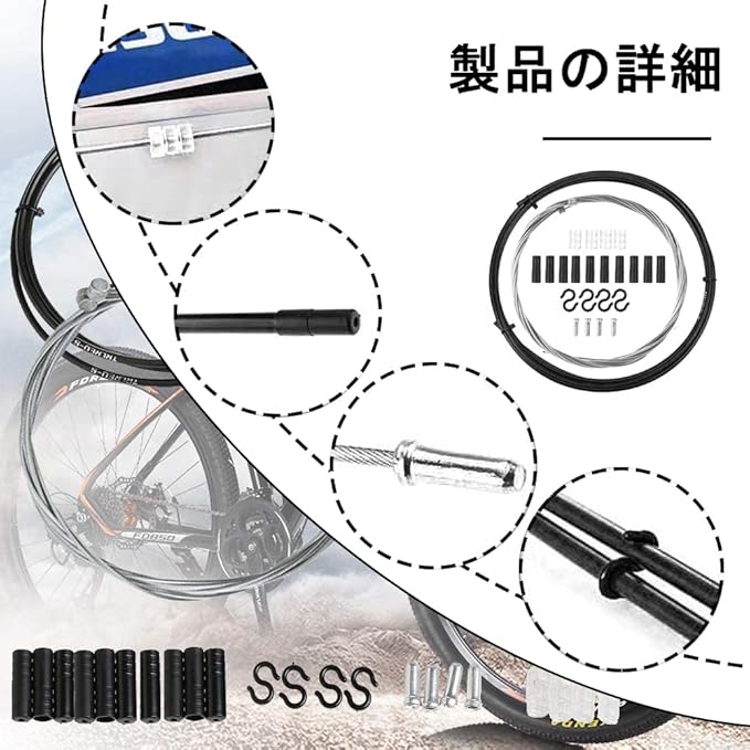 【パッケージ】2.5mブレーキケーブルパイプ*1本、2mシフトワイヤーパイプ*1本、SPケーブルキャップ*16本、1.1mブレーキインナーケーブル*1本、1.7mブレーキインナーケーブル*1本、1.55mシフトインナーケーブル*1本、2.1mシフトインナーケーブル*1本、Sフック*8本、アルミワイヤーテールキャップ*8本、Oリング*4本。