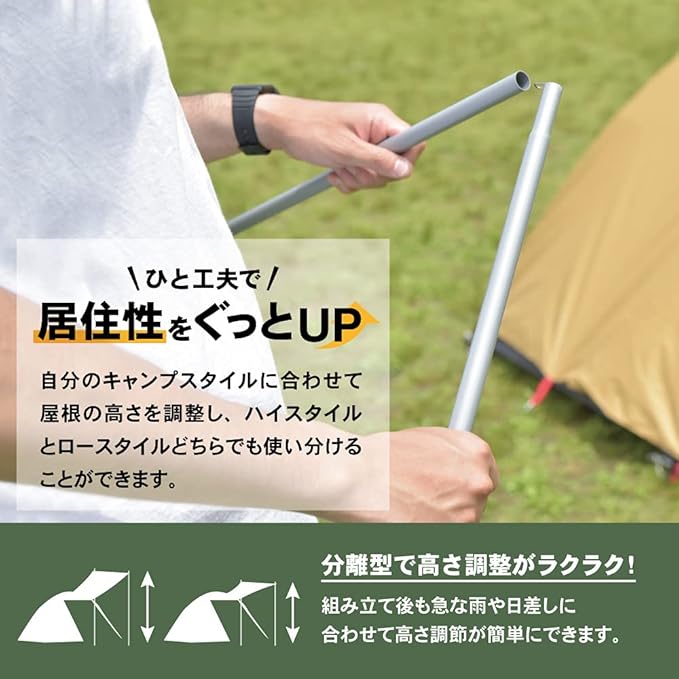 【多種多様なギアとの組み合わせ / サクッとかんたん高さ調整】ドームテント・ワンポールテント・パップテント(軍幕テント)などテントのキャノピー部分、もしくは小型タープのメインポール・大型タープのサブポールなどご自身のキャンプギアと組み合わせて使うことで、テントやタープの力を最大限まで引き出すことができます。【高さ調整可能】テントポールの使い方は3つだけではありません。自分のキャンプスタイルに合わせてハイスタイルとロースタイル使い分けることができます。高さ調整も簡単で、急な雨などの天候の変化に応じて調整することもできます。