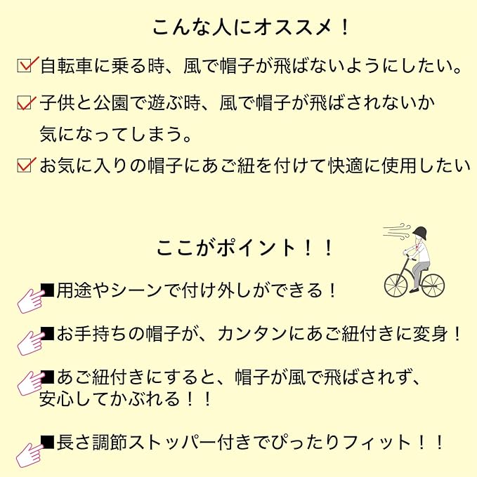 セット内のあご紐は、シンプルなものからよりセキュアなクリップ式まで、さまざまな帽子・用途に応じて選べます。自転車やハイキング、釣りなどのアウトドアシーンでの使用はもちろん、日常生活での突然の風による帽子の飛び防止にも役立ちます。また、子供から大人まで、家族全員で共有できる汎用性の高さも魅力の一つです。