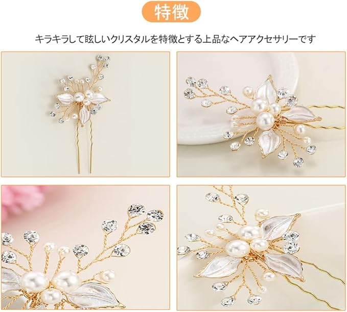 特徴:キラキラして眩しいクリスタルを特徴とする上品なヘアアクセサリーです。三つ葉とパールを星屑のように散りばめたデザインのパーティーヘアピンです。