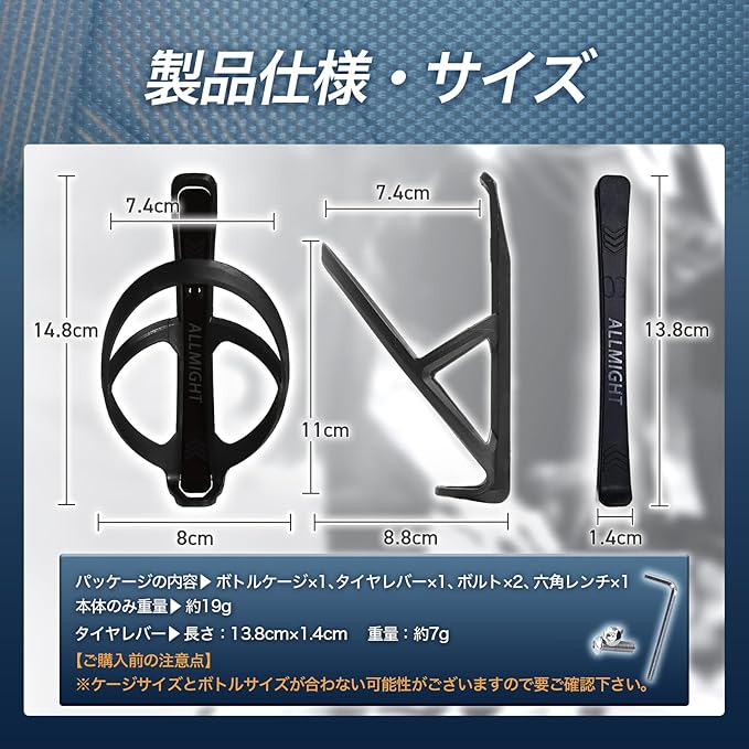 【ご購入前の注意点】※ボトルケージサイズとボトルサイズが合わない可能性がございますので要ご確認下さい。 ※自転車、ロードバイクによってはボトルケージを取り付けることができない場合がありますので要ご確認下さい。 ※取付できない場合は別途ボトルケージマウントをお買い求めください。