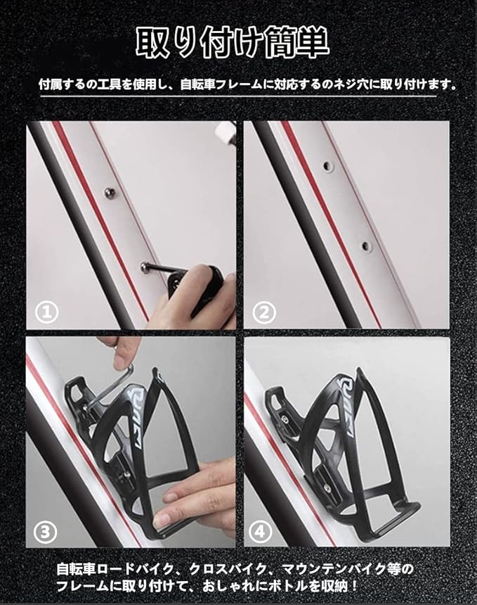 【取り付けが簡単】ダウンチューブ、シートチューブ等、自転車フレームに設置された一般的なボトルケージの台座に、ボルトで簡単に取り付け可能です、傷を付けません。※必要な取り付け金具を含め(単個ボトルケージがネジは2本付属して、取付器具が1枚付属しています)。
