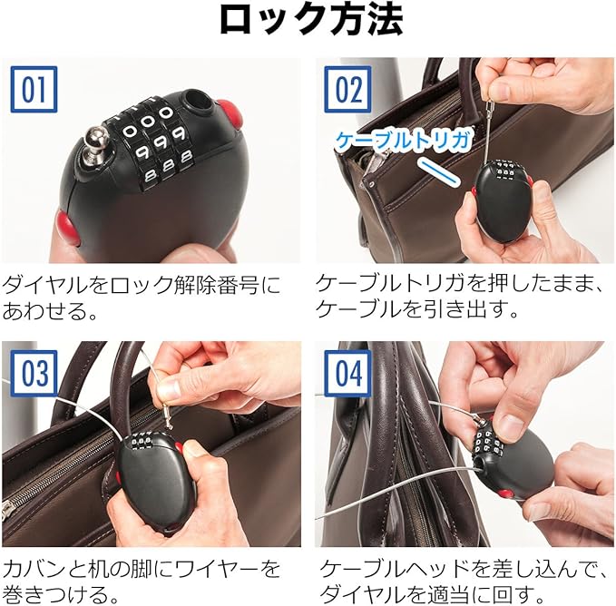 本体にワイヤーをすべて収納できるので、コンパクトに収納できます。バッグやスーツケース、自転車やスノーボードなどの盗難防止に最適です。
