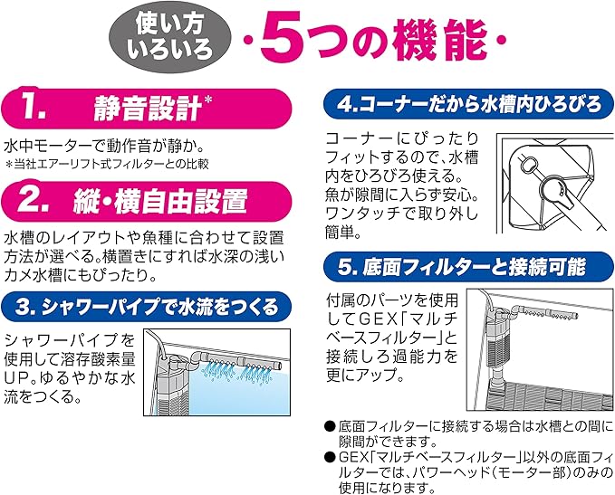 【5つの機能】1.静音設計 水中モーターで動作音が静か。※当社エアーリフト式フィルターとの比較。2.縦・横自由設置 水槽のレイアウトや魚種に合わせて設置方法が選べる。横置きにすれば水深の浅いカメ水槽にもぴったり。3.シャワーパイプで水流をつくる シャワーパイプを使用して溶存酸素量UP。ゆるやかな水流をつくる。4.コーナーだから水槽内ひろびろ コーナーにぴったりフィットするので、水槽内をひろびろ使える。魚が隙間に入らず安心。ワンタッチで取り外し簡単。5.底面フィルターと接続可能 付属のパーツを使用してGEX「マルチベースフィルター」と接続しろ過能力を更にアップ。