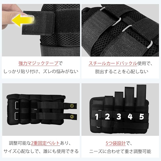 【二重固定&鉄ビーズ中身】強力マジックテープ式、しっかり手首、足首に貼り付け、更に2重固定用ベルド付き、長さの調整可能でサイズに問わず誰でもご利用できます。または中身砂ではなく鉄ビーズを採用していますので排水効果よいです。