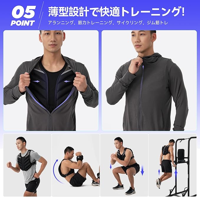 体にぴったりとフィットさせることで、パワージャケットのウエイトを偏りなく上半身に配置し、バランスよく効率的に鍛えることができます。こちらの加重ベストを着用しても腰や両腕両足を自由に動かせますので、ウォーキング、ランニング、スクワット、出勤の際など、ながらトレーニングにも最適。日常生活で上着の下に着る事で周囲に気付かれずに体の強化ができます。