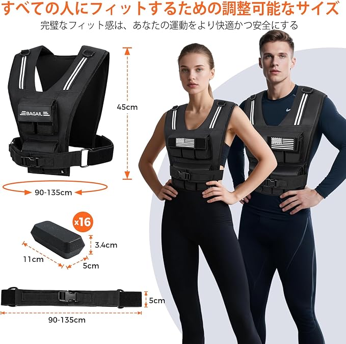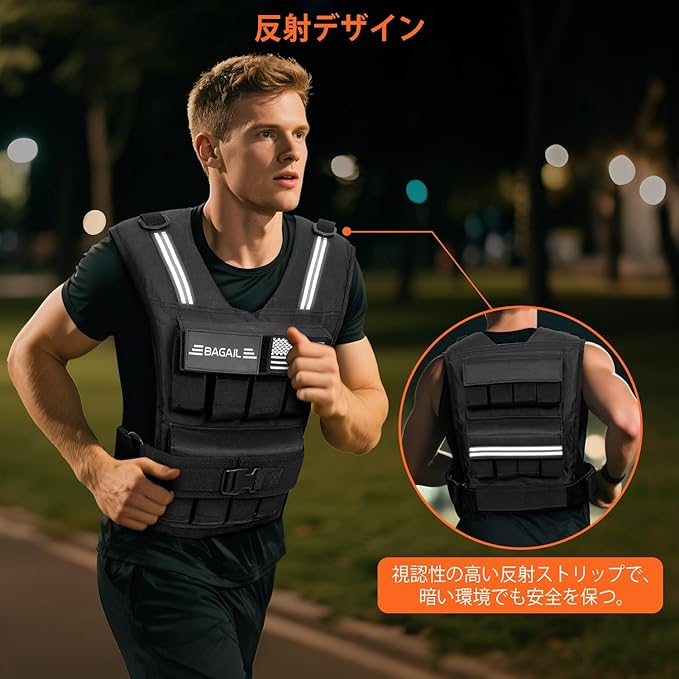 安全性と視認性:幅広仕様のマジックテープストラップと安全バックルにより、しっかりと固定できます。明るさが不足した環境や夜間のトレーニング時に視認性と安全性を高めるため、前身頃と後身頃に反射テープを装備。BAGAIL(バゲイル)反射式ウェイトベストで、安全にトレーニングを行えます。