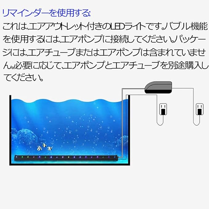 【水族館LEDバブルライト】:これは排気口付きのLEDライトです。バブル機能を使用するには、エアポンプと接続してください。パッケージにはエアチューブまたはエアポンプは含まれていません。必要に応じてエアポンプとエアチューブを別途購入してください。