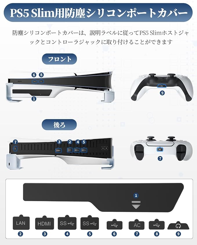 【PS5 Slim Digital Edition/Disc Edition対応 】: PS5 slim デジタルエディション/ディスクエディションに対応する水平ブラケット、底部のスペースを節約します。 製品セット内容:1 *USB水平ブラケット、1 *固定ネジ、PS5スリムコンソールダストプラグ(9個)1セット。