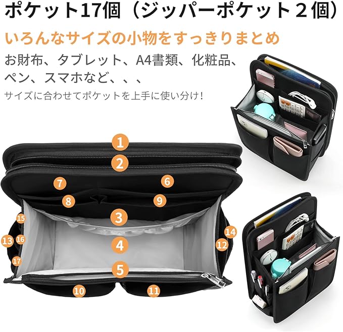 【探しやすく17個機能ポケット】バックインバックは貴重品や化粧品、携帯、長財布、鍵、カードなど、マチあり仕切りで小物を種類別で整理できます。ゴチャゴチャしているバッグの中がすっきりと片付きます。色の浅いインナーで内容物が一目瞭然、取り出し易く使いやすい鞄になります。