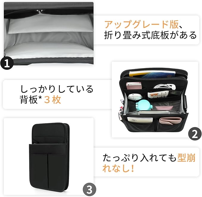 【超軽量】バックインバックは自立している分、多少に重さが感じますが、持ち運びなら気にならない程度です。リュックの重さをそれほど変わらないので持ち運びにも苦労しません。バッグからバッグへの入り替える簡単で、ママバッグとしても便利です。【側/後ろにチャックあるリュック】側に日常小物を入れるポケット6つあり。口金リュックの両側スペースにも機能させるし、側/裏にチャックが付いたリュックの中身出し入れもやすくなります。通勤通学、海外旅行など、途中で使う小物が多い場合に適しています。