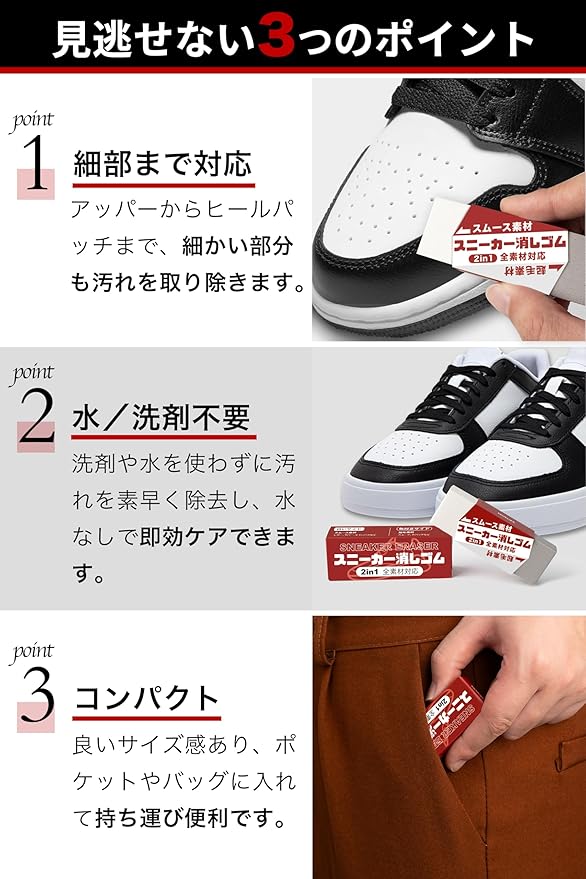 【汚れだけを落とす・スニーカーをキレイに】スニーカー専用の消しゴムを使うと、汚れだけを効果的に吸着し、すぐにキレイにします。靴に優しく、常に美しい状態を保つことができます。汚れを落とすには適度な摩擦が必要ですが、消しゴムタイプのため、削りカスがかなり出ることがあります。※長期間放置した汚れや経年劣化による黄ばみなどは落とせません