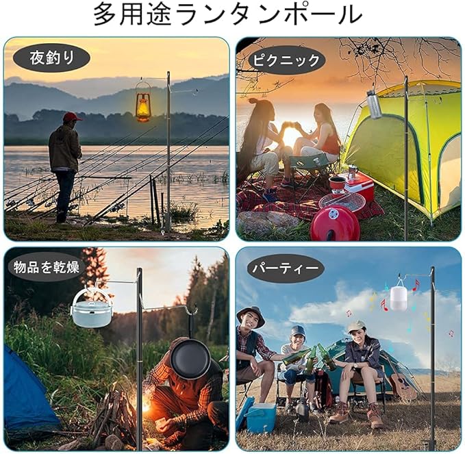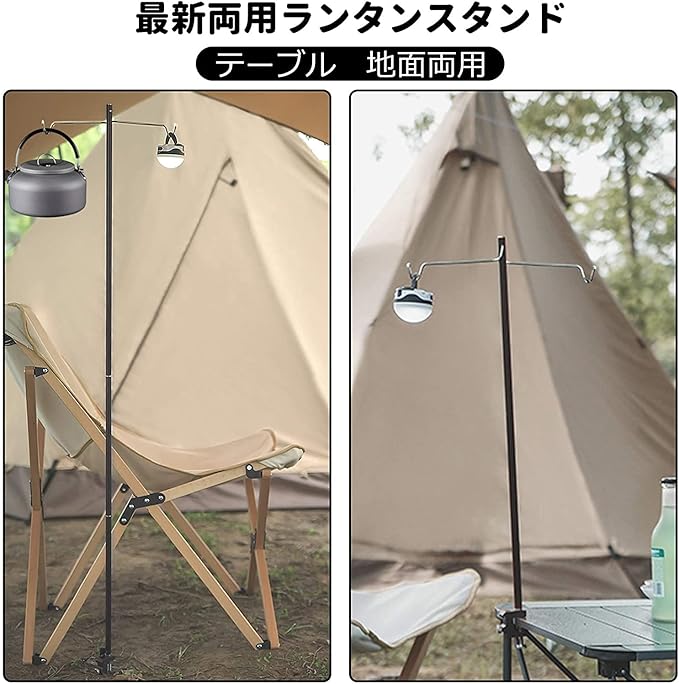 ►【高品質な素材】ランタンスタンドのアルミ合金製のポールは直径は12mmまで、ポールの壁厚も1mmの厚さを採用されて、全体の耐荷重が大幅のアップとなります。固定クリップとグラウンドペグは高品質のスチール製であるため、ランタンポールをテーブルまたは地面にしっかりと固定で、揺れなく、安定となります。フックも高品質のステンレス製で、重いものを吊るしても変形しません。