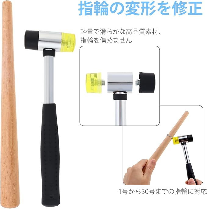 【パッケージ】1 x 指輪サイズ棒、1 x 日本標準規格リングゲージ、1 x 木製棒、1 x ハンマー。