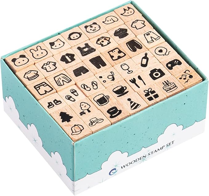 新製品 木製スタンプ 手帳 スタンプ 木製 セット 【42個入り】 小さい 小型 日常 手帳用 スタンプ セット ミニ シンプル 飾り DIY ゴム印 (ブルー)